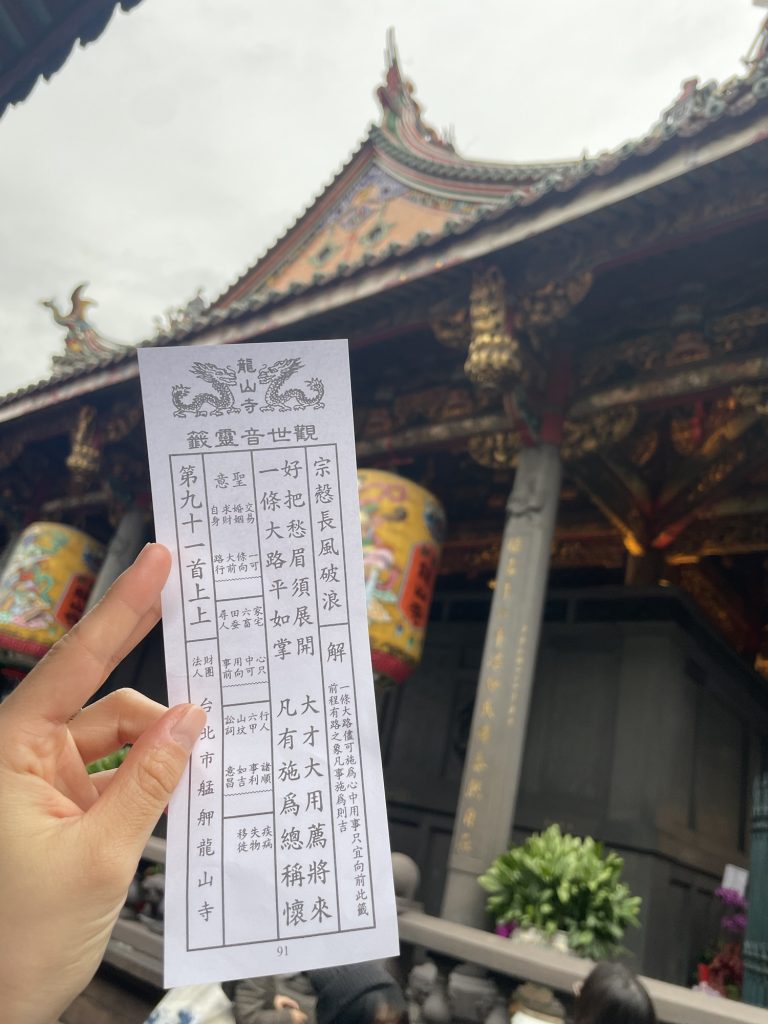 龍山寺では、おみくじの説明してくれる場所があり、日本語対応可能でした。対応してくれる人によって、色々説明、助言をしてくれる人、一言で終わる人様々でした。私の担当してくれたおじさんは一言で終了でした笑