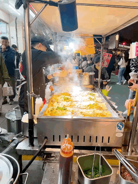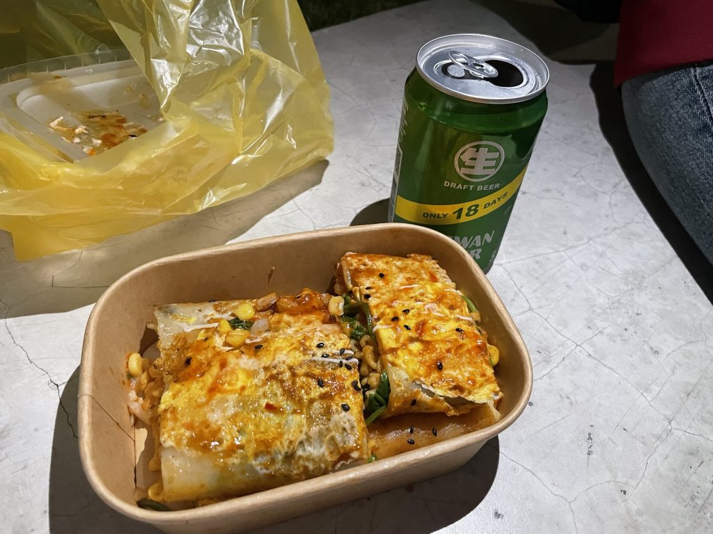 私は、卵を焼いた物の中に甘辛い麺が入った広島焼き的なものを、台湾ビールと共にいただきました。麺はプルダックポックンミョンのような食感と味付けで美味しかったです。ビールに合う!!
